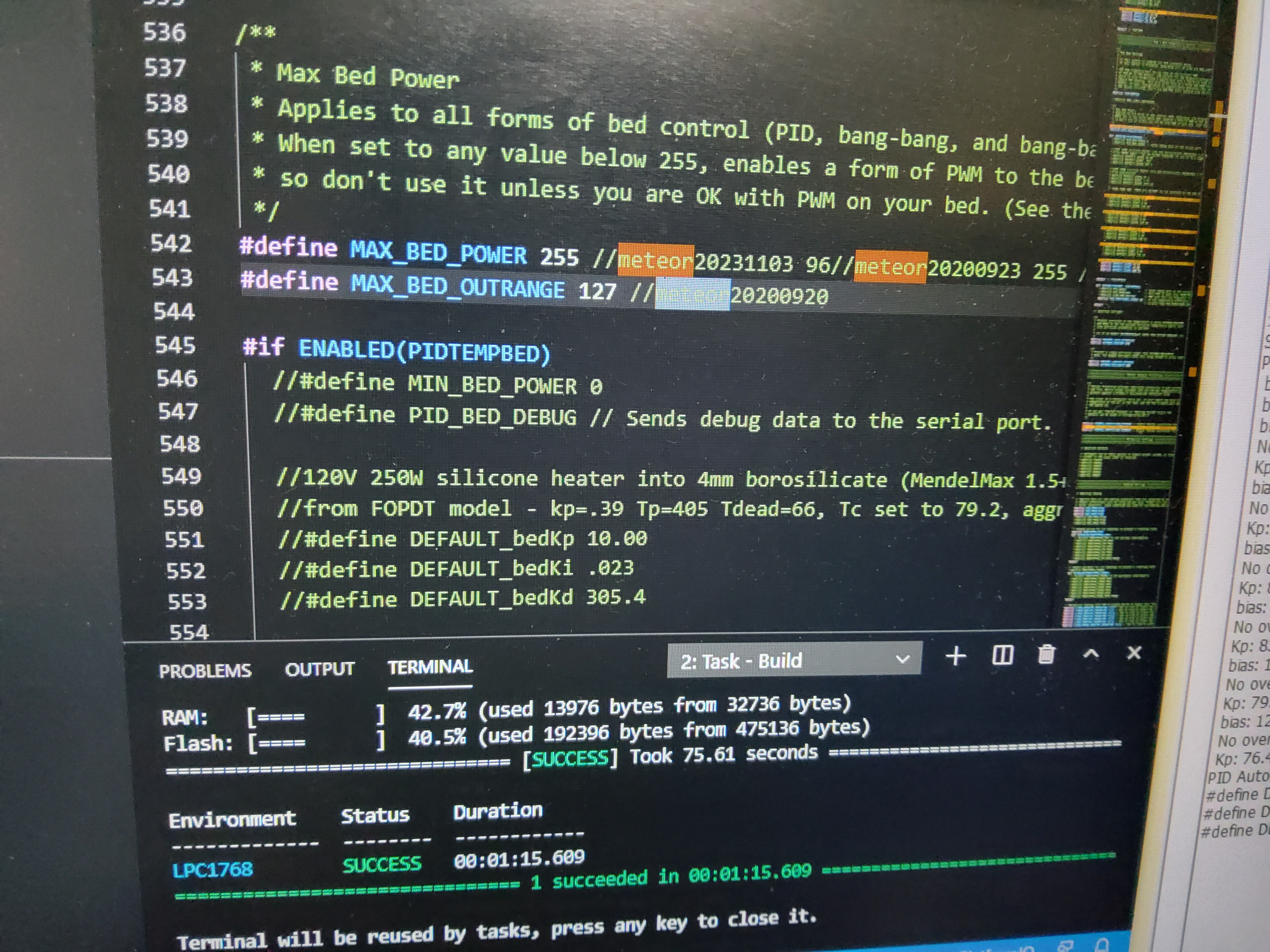 다음은 펌웨어쪽. 12V 75W베드를 24V에 연결하면 300W쯤 됩니다만 파워가 너무 세서인지 PID컨트롤이 안먹기 때문에 최대 출력값을 낮춰 놓았는데 그부분을 복구했습니다.